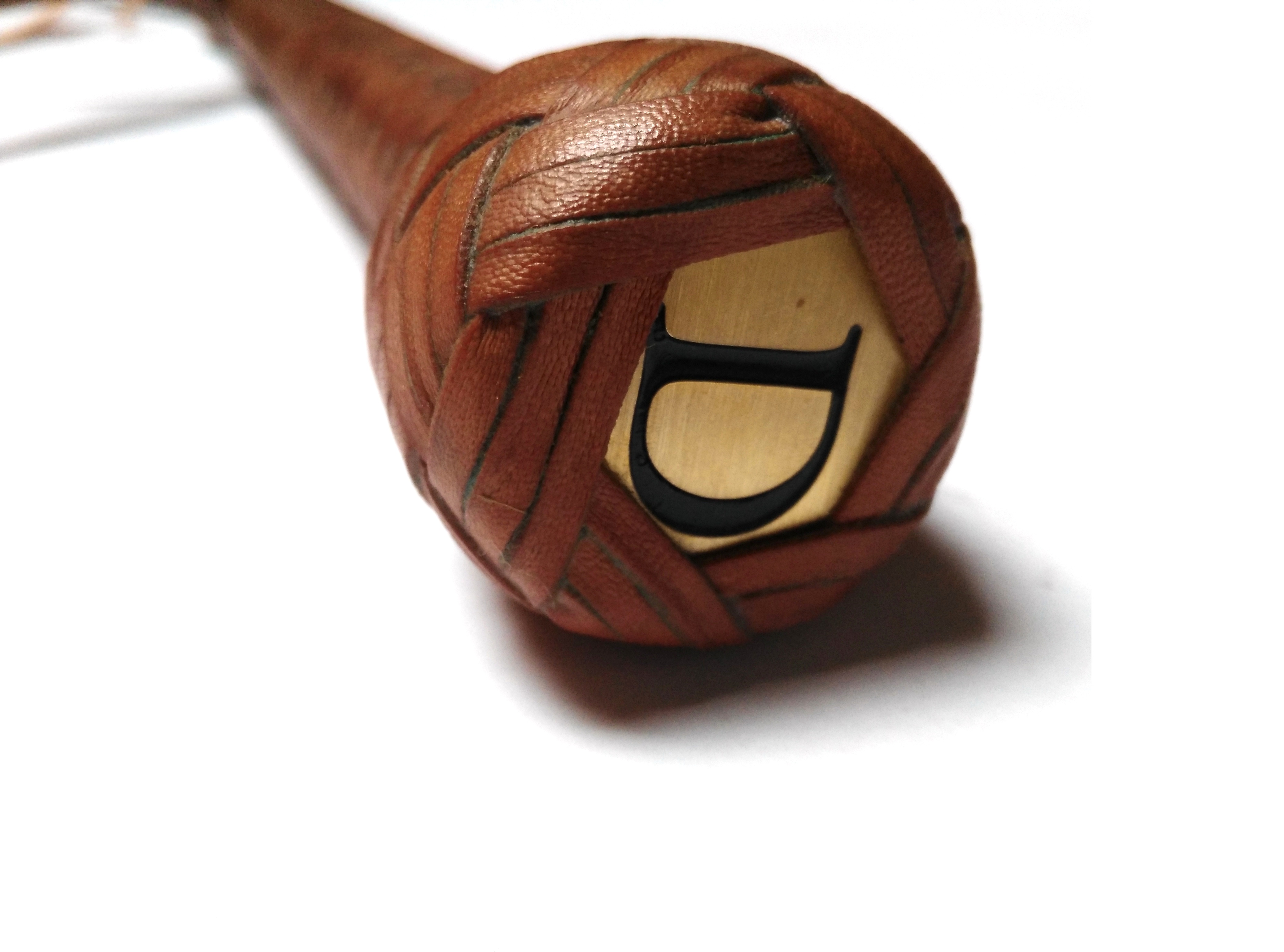 L’intreccio esterno in 16 listine di canguro color whisky presenta una particolare trama ”fantasiosa” situata nella parte centrale del manico.