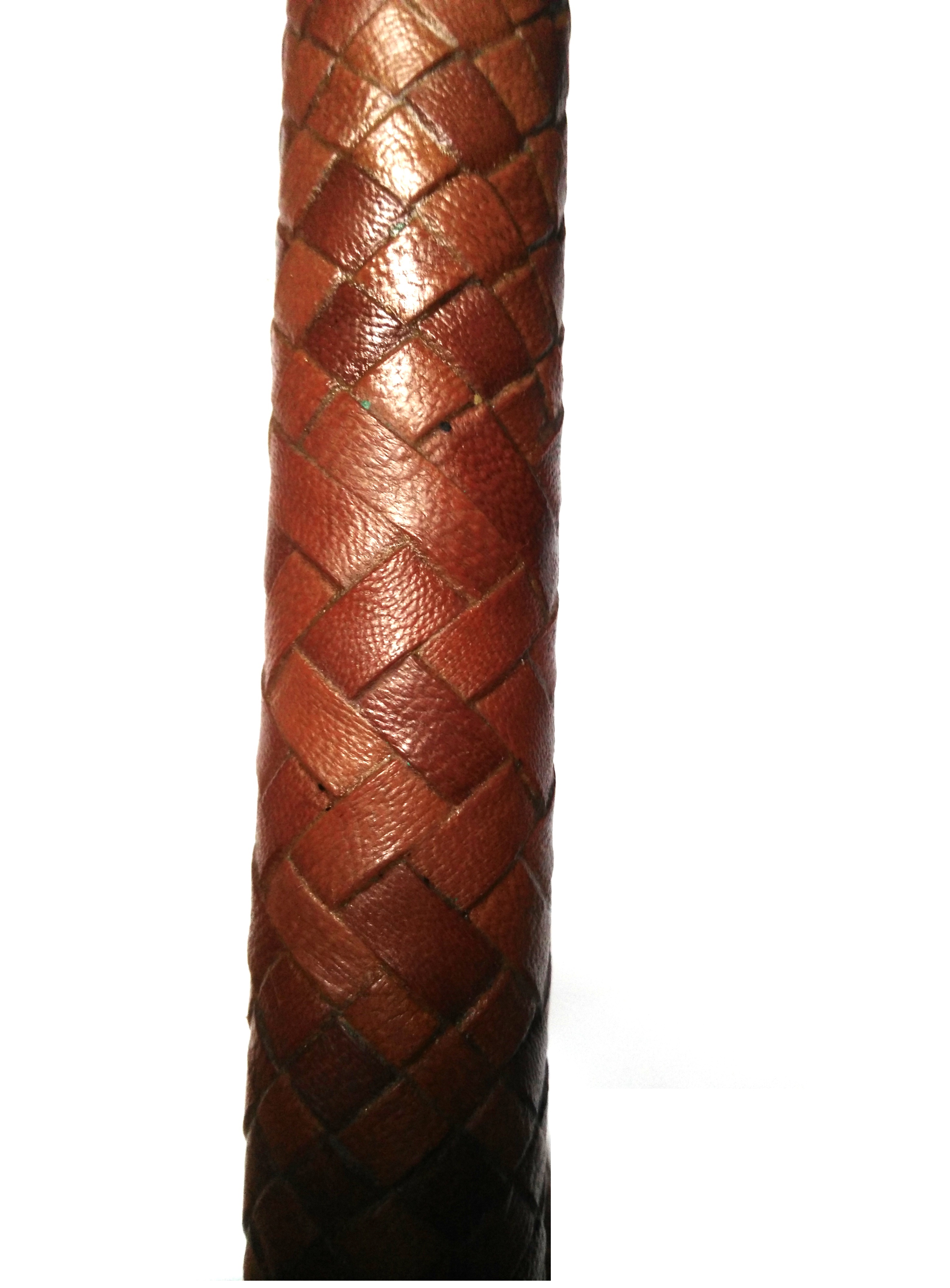 Intreccio esterno della frusta realizzato in 16 listine di canguro lungo 5 piedi color whisky, manico da 30cm, rinforzo area giunzione manico corpo della frusta per 22cm.